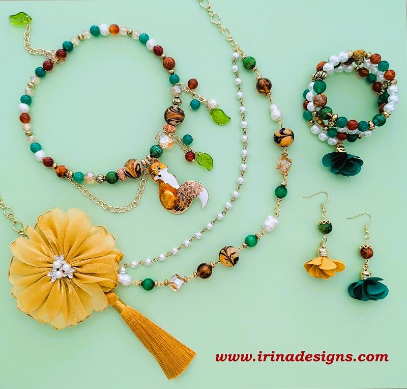 The set is handcrafted with agate, aventurine, quartz, pearls, jasper, glass lampwork and gold-plated chain/findings.