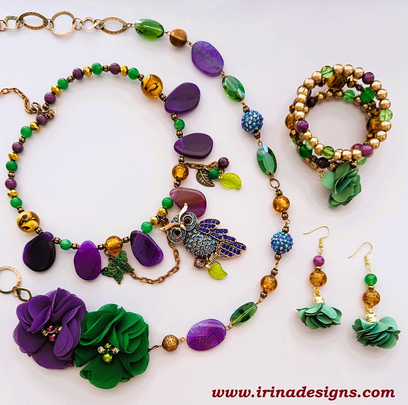 The set is handcrafted with agate, aventurine, quartz, glass lampwork, rhinestones and copper tone chain/findings.